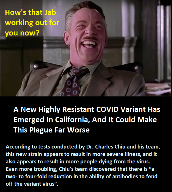 How’s that Jab Working for You Now? Posted on 21 02 25 by Hyper Report Article: http://endoftheamericandream.com/a-new-highly-resistant-covid-variant-has-emerged-in-california-and-it-could-make-this-plague-far-worse/